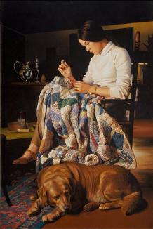 | Title: Marcia Sewing Variation III (HYPERREALIST FIGURATIVE SERIES); Artist: Ian Hornak Medium: Acrylic on Canvas; Size: 50 x 72"; Year: 1978. OWNED BY THE COLLECTION OF THE MUSEUM OF FINE ARTS BOSTON |