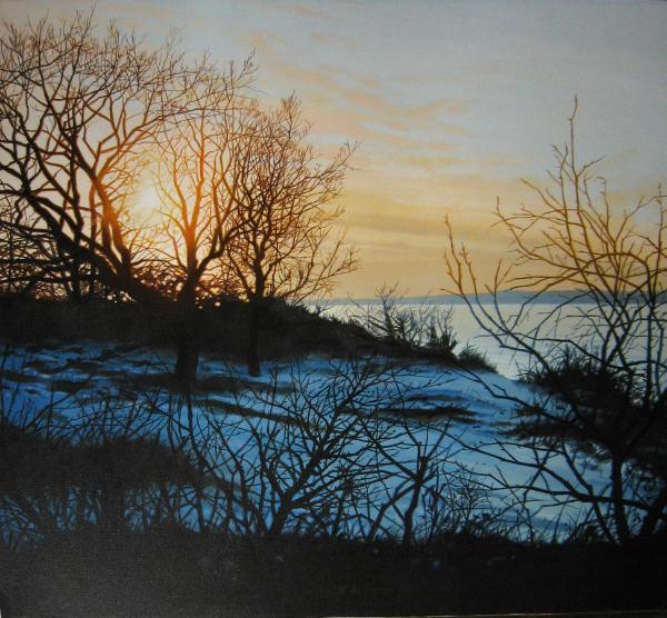 | Title: Winter, Sunrise over a Bay [Long Island Sound]; Artist: Ian Hornak; Medium: Acrylic on Canvas; Size: 28 x 28"; Year: 1972. OWNED BY THE COLLECTION OF THE CORCORAN MUSEUM, WASHINGTON D.C. |