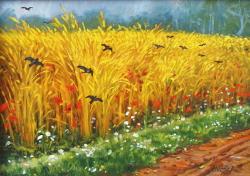 | Title: Wheat Field's and Poppies; Artist: Ian Hornak; Size: 8 1/2 x 11 1/2"; Medium: Oil on Panel;Year: 1996; Private Collection |