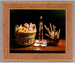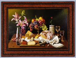 | Title: Bread, Cheese, Grapes and Lilies; Artist: Ian Hornak; Medium: Oil on Panel with Artist Painted Frame; Size: 43 x 58 1/2"; Year: 2001. Provenance: Private Collection |