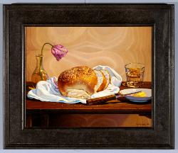 | Title: Still Life with Bread and Butter; Artist: Ian Hornak; Medium: Oil on Panel with Artist Painted Frame; Size: 29 x 34"; Year: 1996. Provenance: Private Collection |