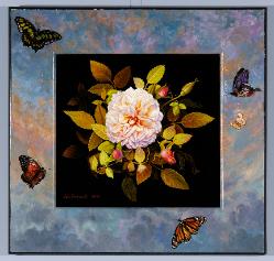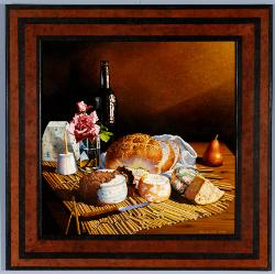 | Title: Bread, Cheese and Pink Rose; Artist: Ian Hornak; Medium: Oil on Panel with Artist Painted Frame; Size: 45 x 45"; Year: 1999. Provenance: Private Collection |