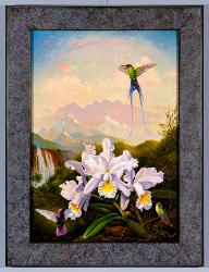 | Title: Morning: White Calleya Orchids with Three Humingbirds; Artist: Ian Hornak; Medium: Oil on Panel with Artist Painted Frame; Size: 39 x 29 1/2"; Year: 2002. Provenance: Private Collection |