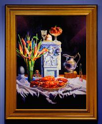 | Title: Lobster, Helicona & Silver Pitcher; Artist: Ian Hornak; Medium: Oil on Panel; Size: 46 x 35"; Year: 1998. Provenance: Private Collection |